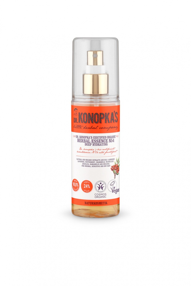 Organic herbal essence № 54 consists of organic plant extracts and oils, plus complex vitamins, macronutrients and mineral nutrients essential for moisturising and regulating the water balance in skin cells. Lavender, chamomile and melissa prevent moisture loss to soothe skin, making it firm and tight. Peppermint, water lily and witch-hazel tone and refresh the skin, leaving it with a healthy glow.